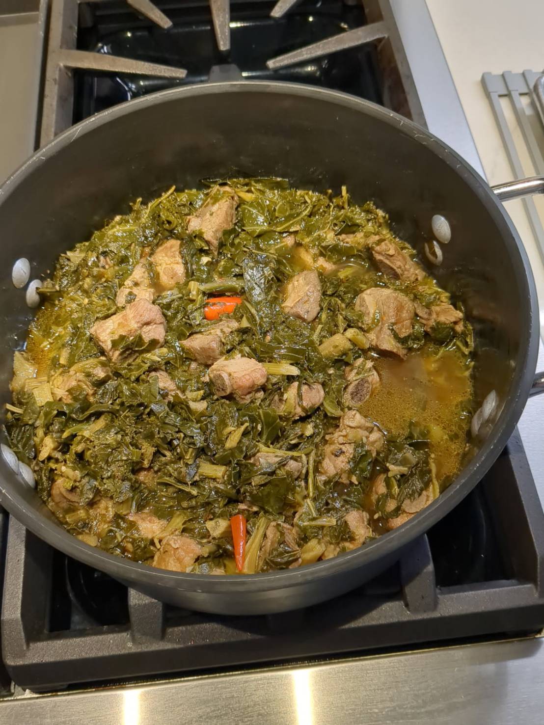 - Add Greens: Stir in remaining greens until wilted, add chilies, nestle into pot. Cover and simmer on low 60 minutes until ribs are very tender.