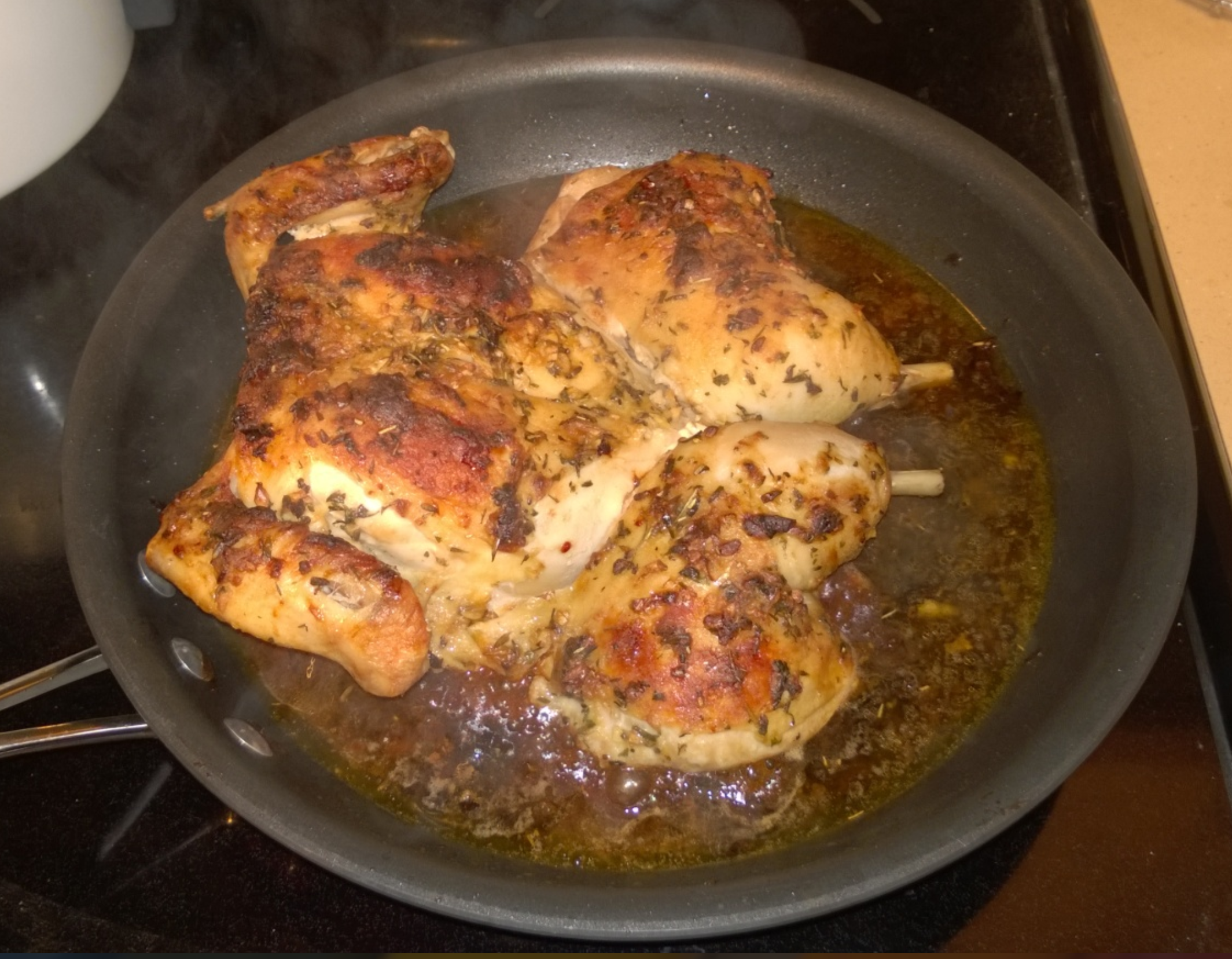 - Return to the stovetop and deglaze with ½ C chicken stock and a few tablespoons of red wine. Let the chicken rest for 5 minutes. Transfer the chicken to a cutting board, cut it into 8 pieces and serve.